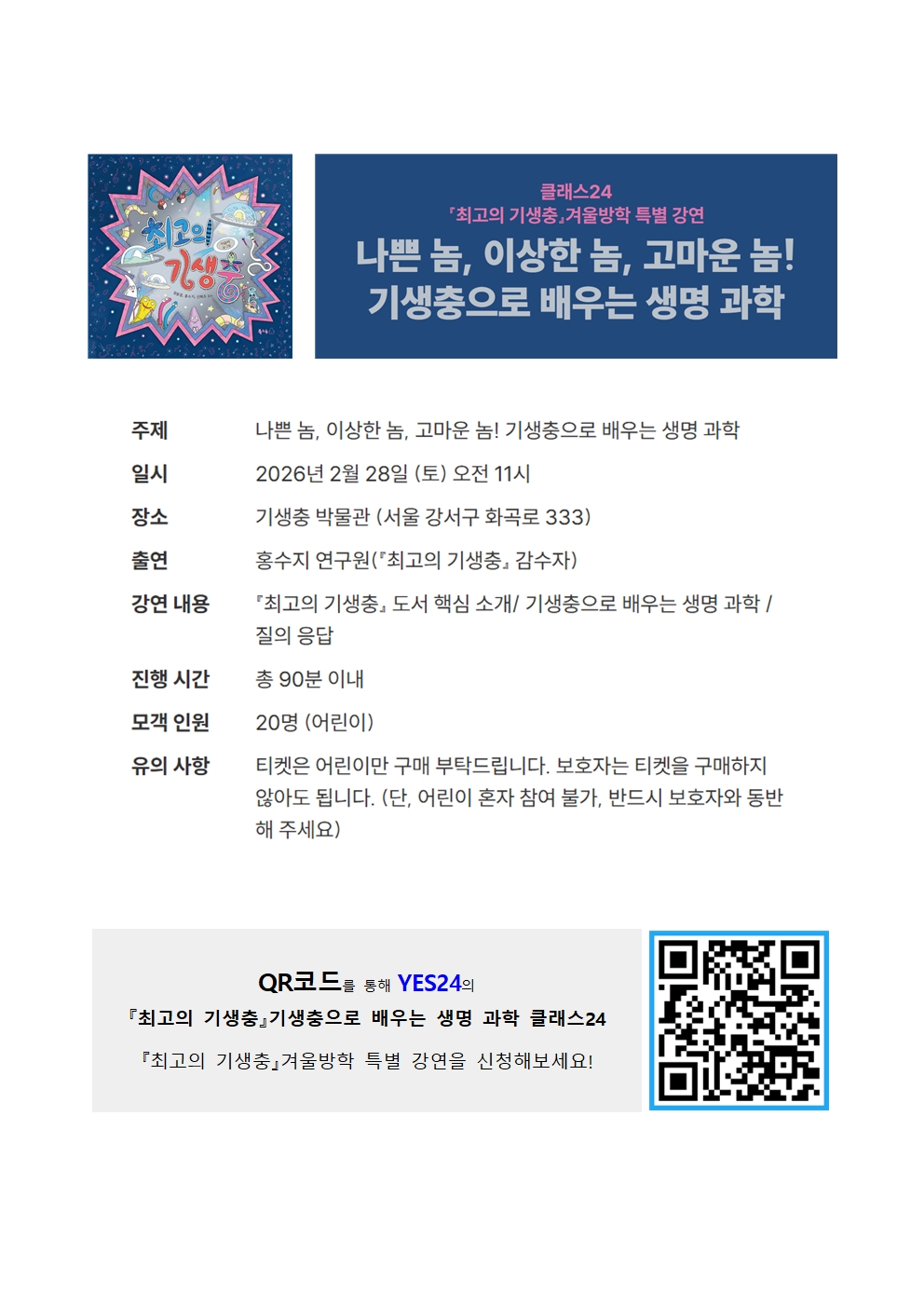 『최고의 기생충』기생충으로 배우는 생명 과학 클래스24 『최고의 기생충』겨울방학 특별 강연 [ 2026년 2월 28일(토) 오전 11시/기생충 박물관 ]